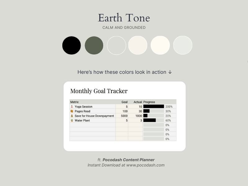 More importantly, your colour palette should either match your brand identity or reflect the vibe and purpose of the spreadsheet. For example, a financial dashboard benefits from calm, professional tones, while a personal habit tracker may feel more approachable with soft pastels. When your colours align with your brand, your templates instantly feel cohesive, polished, and recognizable.
