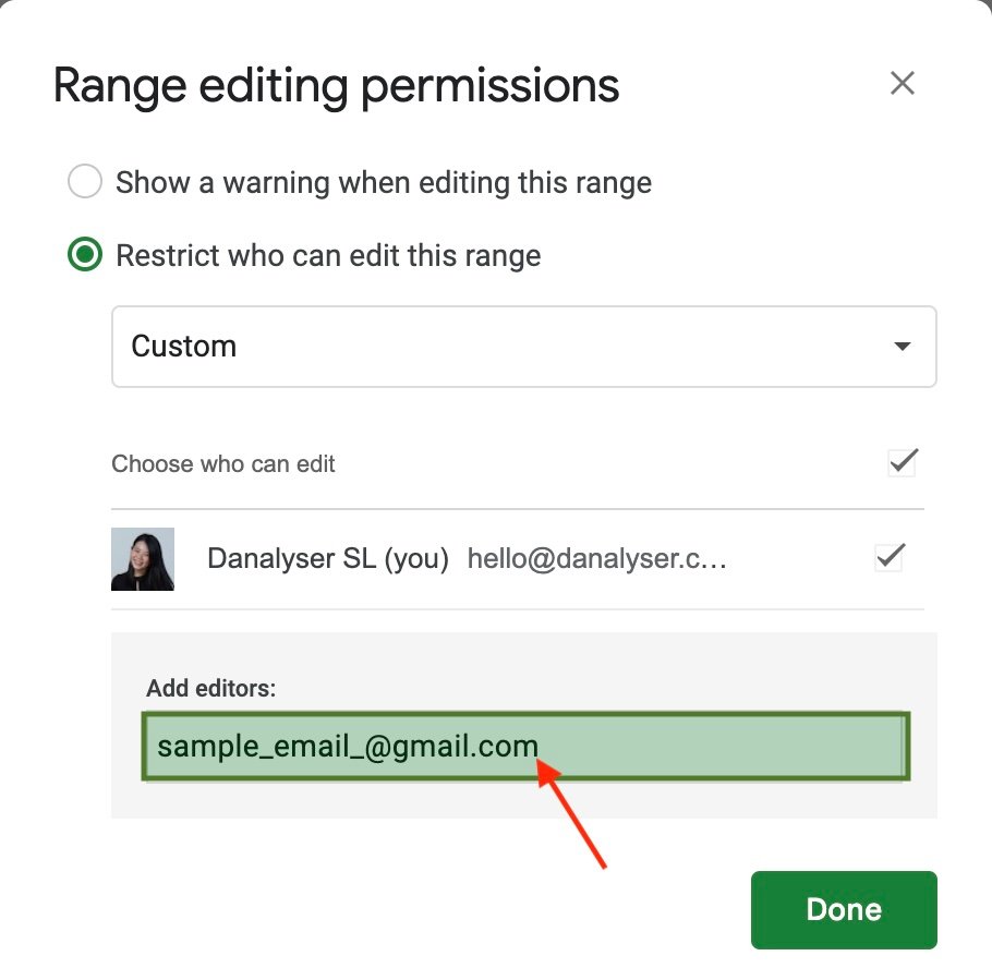 3. Set Permissions – A sidebar will open, allowing you to set permissions. You can restrict access to only yourself or specify who can edit those particular cells or ranges. After configuring the permissions, click Done, and your selected cells are now protected.