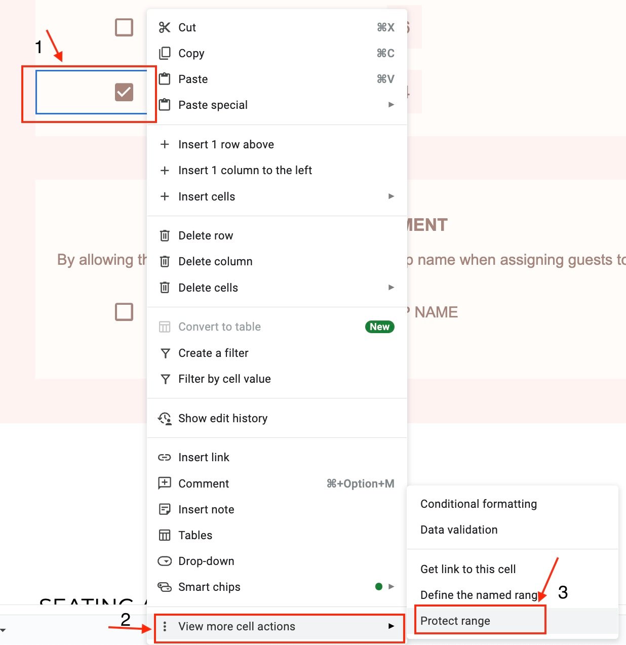 2. Protect Cells – Right-click on the highlighted area, select “View more cell actions”, then select “Protect range” from the dropdown menu.