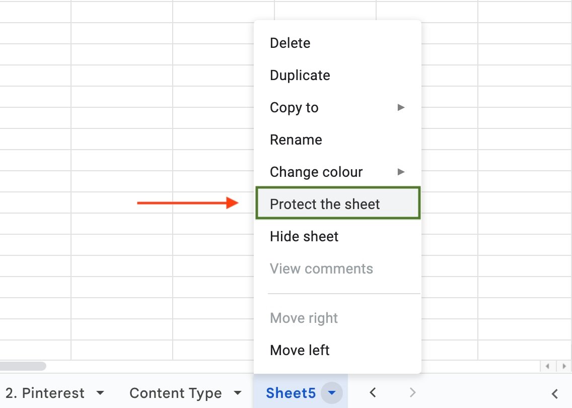 1. Right-Click the Tab – Navigate to the sheet you want to protect, right-click on the tab, and select Protect the sheet.