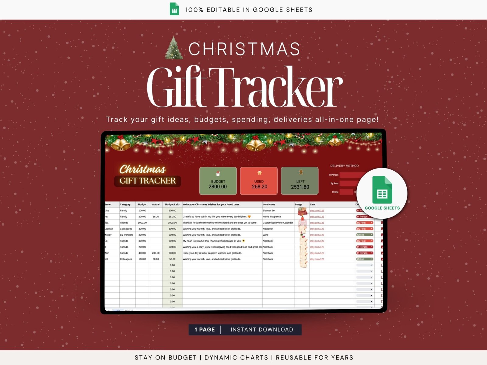 โฃ 1 Pager Christmas Gift Tracker Spreadsheets (Google Sheets)