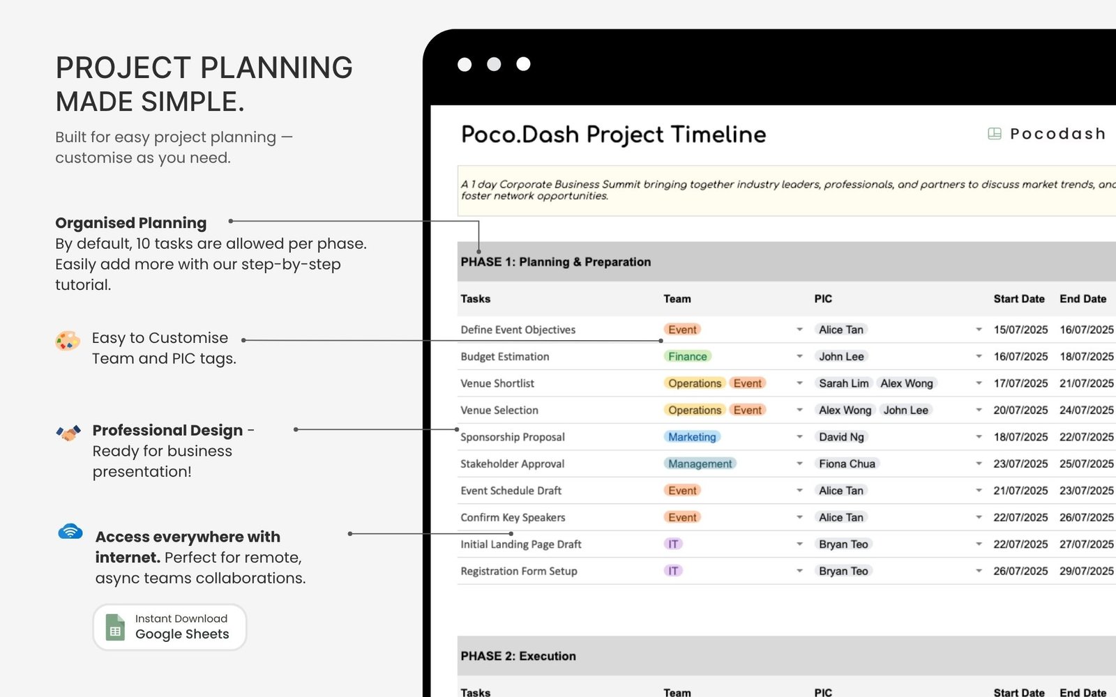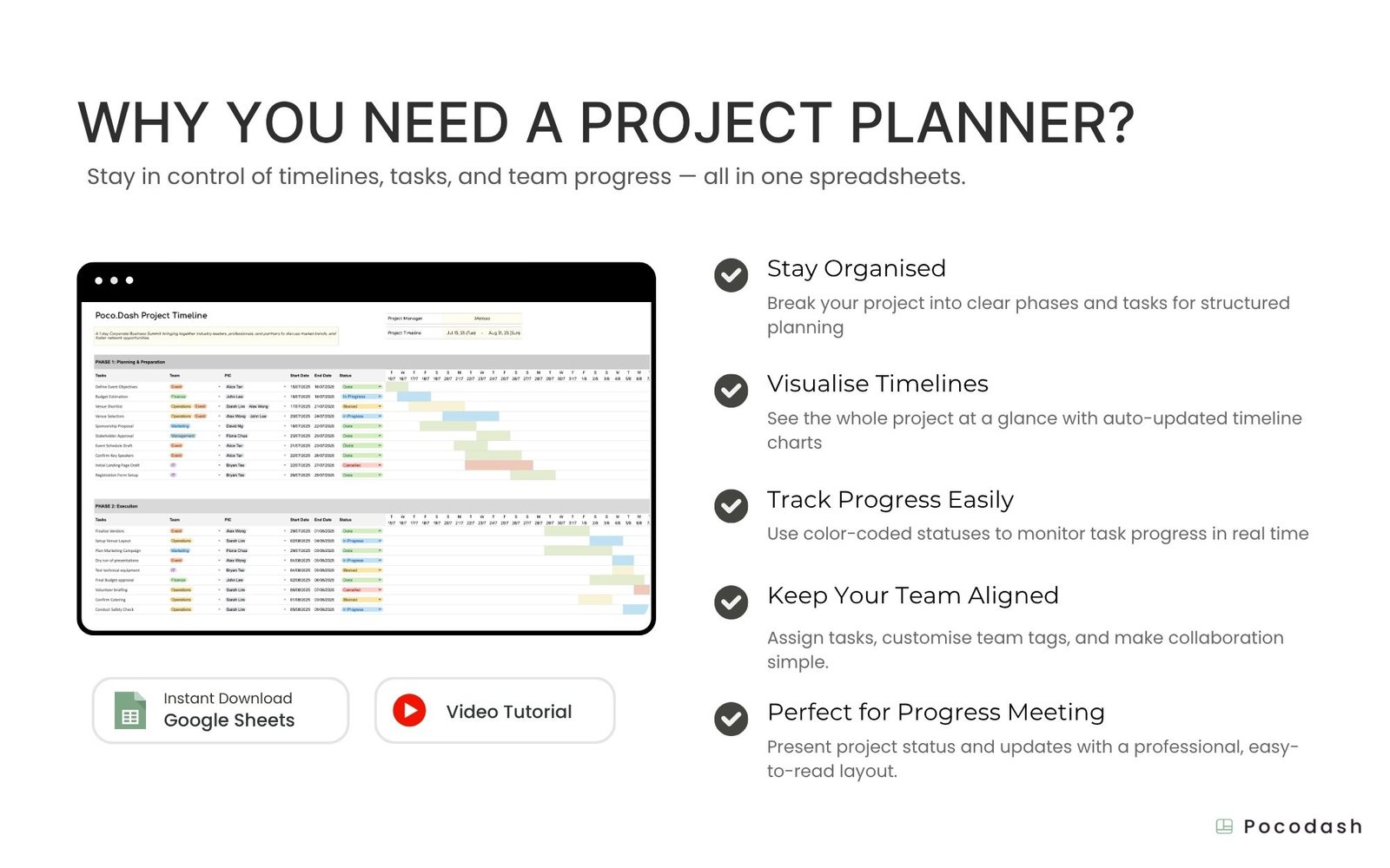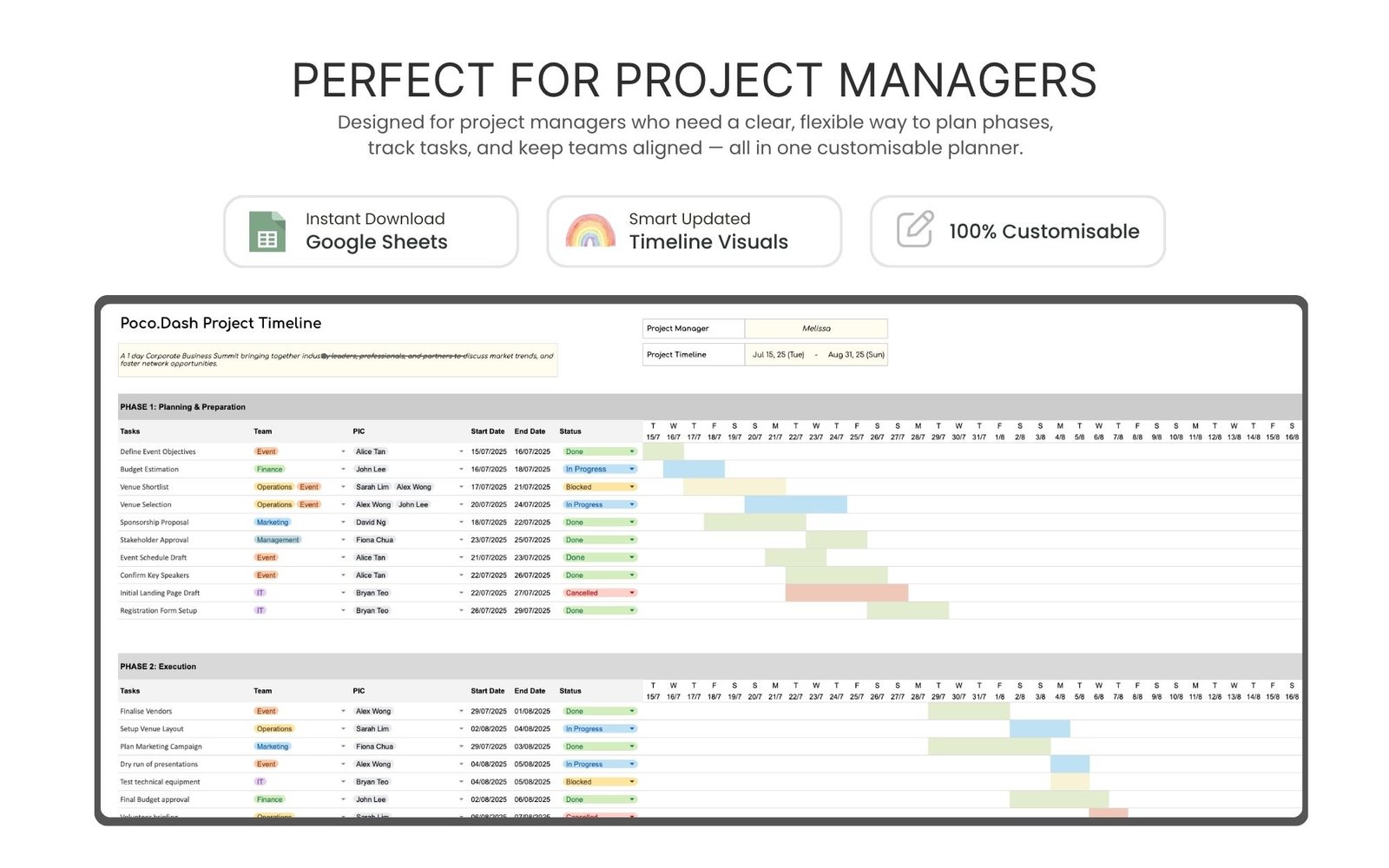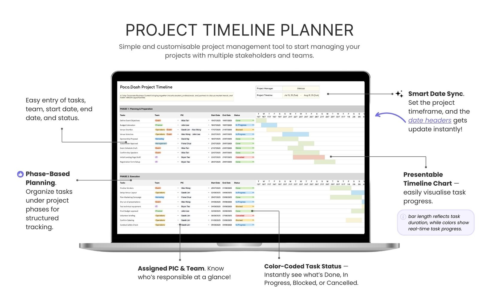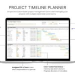 This Project Timeline Template is designed to help project managers and event organisers plan and visualize project timelines, track progress, manage team responsibilities for a timely project delivery.